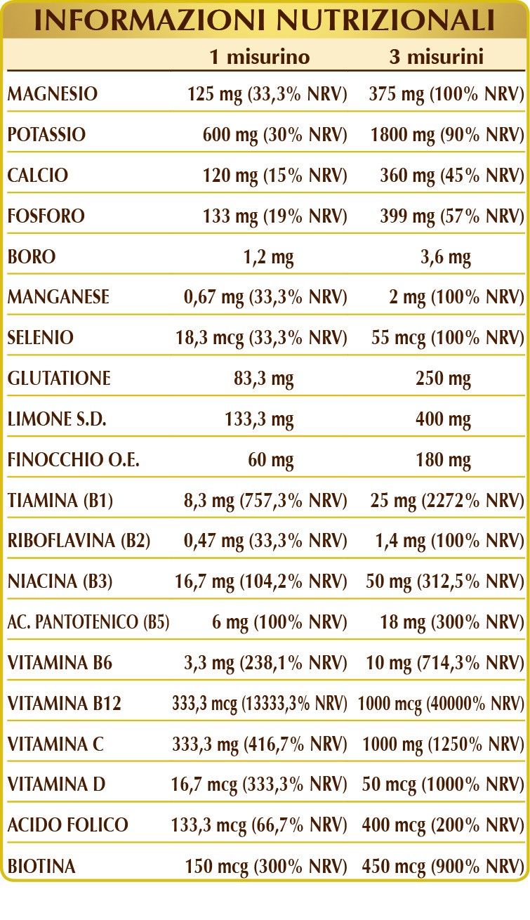 Maltodestrine da mais e riso, potassio citrato, magnesio citrato, calcio glicerofosfato, magnesio glicerofosfato, vitamina C (acido ascorbico), magnesio gluconato, magnesio pidolato, potassio gluconato, limone (Citrus limon) frutti S.D., glutatione ridotto; aroma naturale: limone (Citrus limon) frutti O.E.; sodio selenito, vitamina B3 (niacina e nicotinamide), vitamina B1 (tiamina cloridrato), sodio borato, vitamina B5 (pantotenato di calcio), lichene (Cladonia rangiferina) tallo E.S. (titolato in vitamina D3 colecalciferolo 100.000 UI/g), manganese gluconato, vitamina B6 (piridossale 5-fosfato); edulcoranti di origine naturale: glicosidi steviolici e taumatina; vitamina B2 (riboflavina 5-fosfato di sodio), vitamina B12 (5-deossiadenosilcobalamina e metilcobalamina), acido folico (L-metilfolato di calcio), biotina.